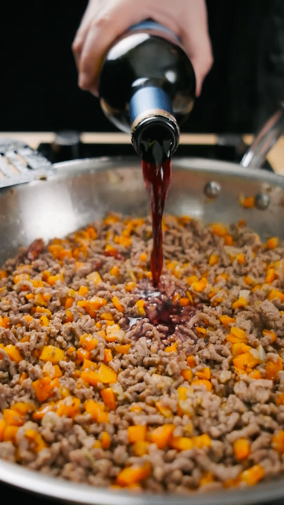 Pour in red wine and scrape the brown bits from the pot.