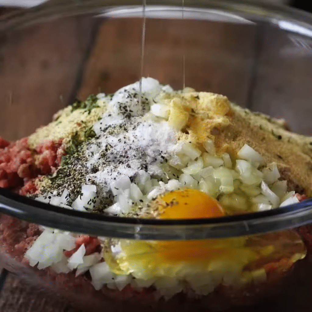 2. Mix ground beef, breadcrumbs, egg, onion, garlic powder, Italian seasoning, salt, and pepper.