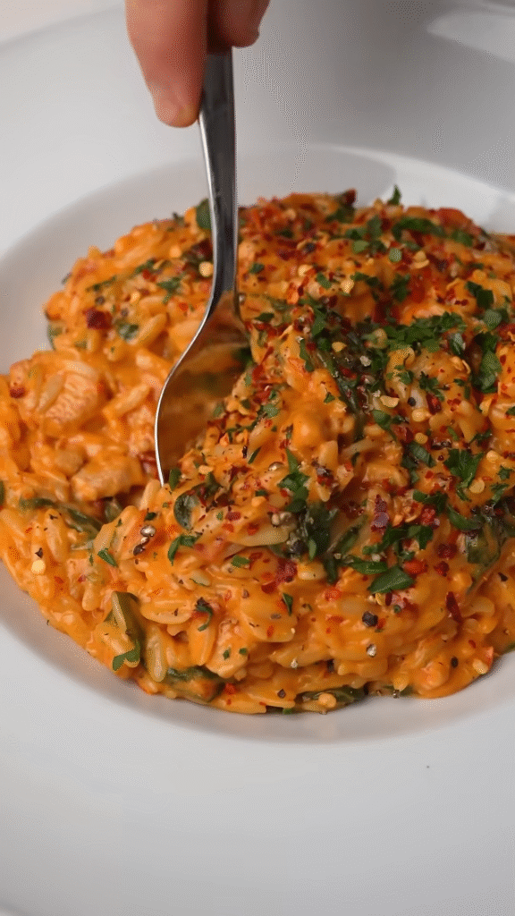 This Orzo Chicken is a simple yet luxurious one-pot meal that gives you juicy, seasoned chicken nestled in a creamy, flavorful bed of tender orzo pasta.