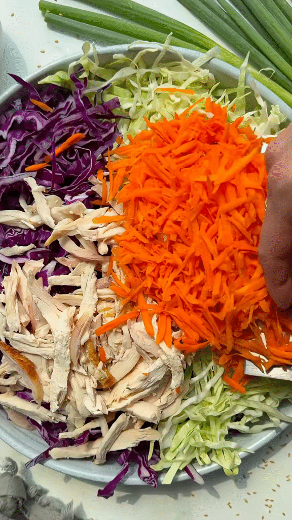 - Combine cabbage, carrots, green onions, cilantro, and peanuts.